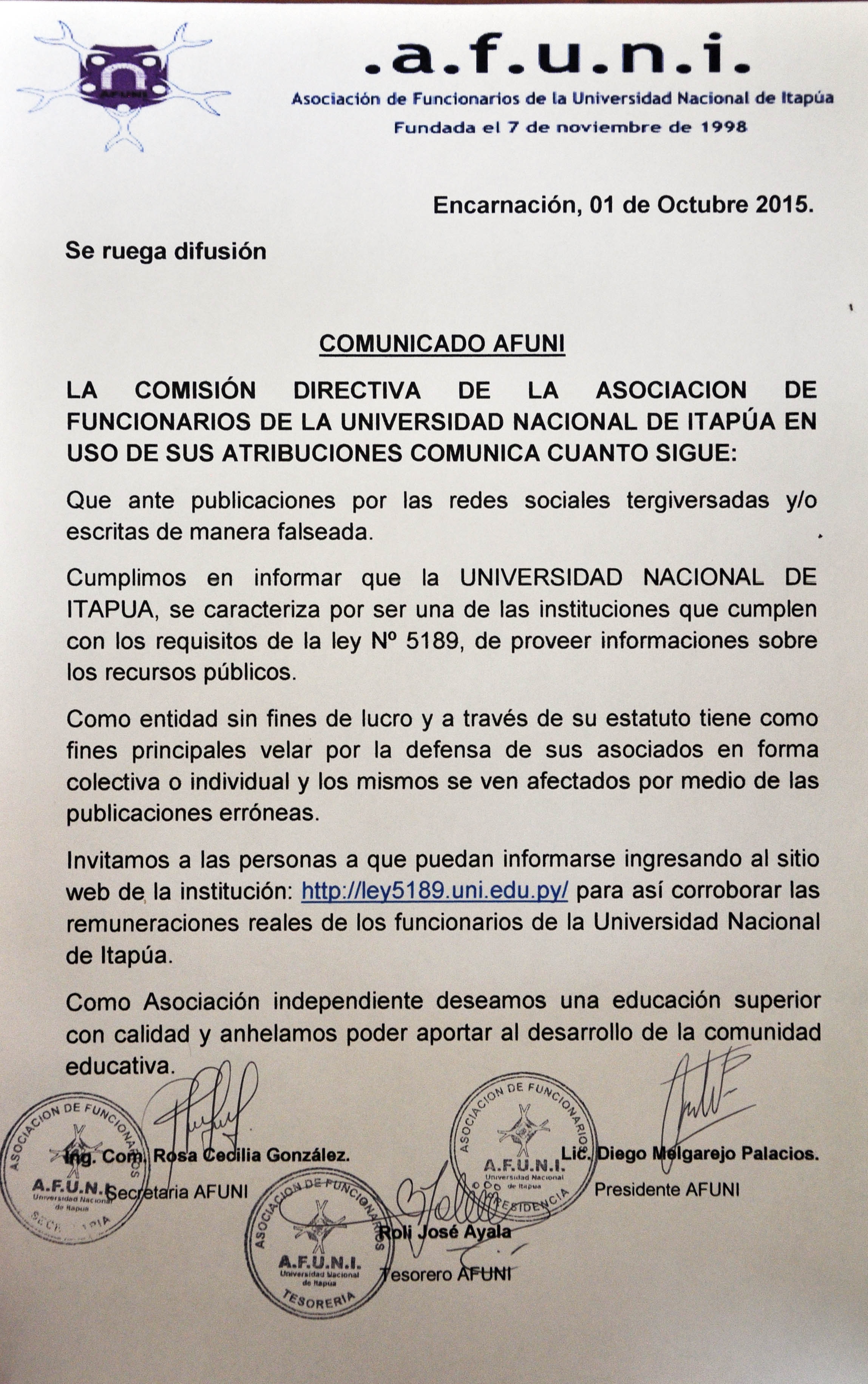 La Asociación de Funcionarios de la Universidad Nacional de Itapúa (AFUNI) emitió esta mañana un comunicado que confirma y da fe del acatamiento de la Ley 5189 en la Universidad Nacional de Itapúa (UNI), que establece la obligatoriedad de proveer informaciones acerca del uso de los recursos públicos sobre remuneraciones y otras retribuciones asignadas al funcionario público de nuestro país. Clic aquí para ver el comunicado original.