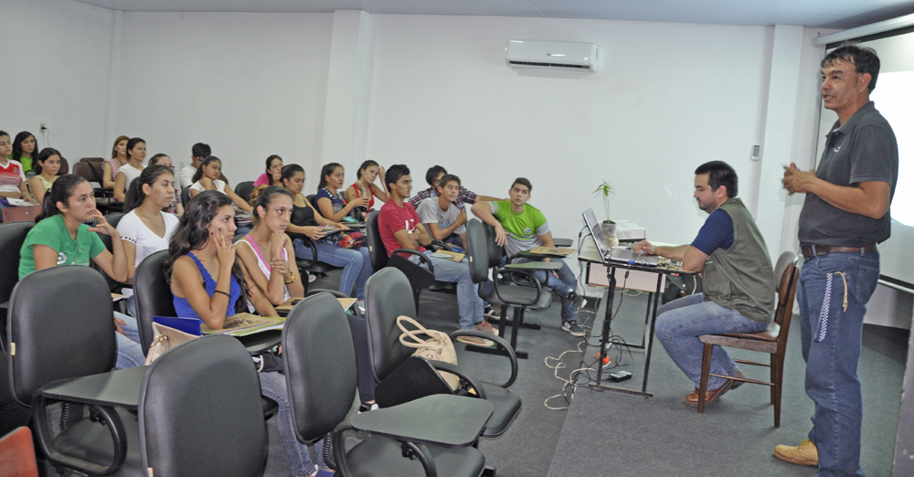 Técnicos Especialistas en Educación Ambiental del Sector de Medio Ambiente de la Entidad Binacional Yacyretá brindaron una charla sobre la importancia del cultivo de la crotalaria (crotalaria juncea) como alternativa para el control biológico contra el aedes aegypti, mosquito transmisor del dengue, zika y chicungunya. La actividad se cumplió en el salón auditorio de la Facultad de Ciencias y Tecnología (FaCyT). Luego de las explicaciones sobre plantación, manejo y cuidado cultural de la planta leguminosa, los técnicos realizaron una demostración de cómo plantar la semilla de crotalaria.