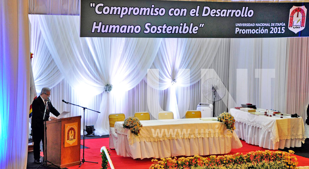En dicho contexto luego de saludar a los presentes e invitados especiales y augurar éxitos a los nuevos egresados, expresó la Universidad Nacional de Itapúa una vez más, reune para celebrar la exitosa culminación de un año lectivo, caracterizado por importantes desafíos que se viene sorteando con energía, voluntad; con la mirada puesta en aportar al mejoramiento de la calidad de vida individual y colectiva de nuestros conciudadanos.