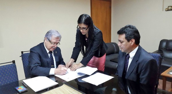 Pactaron el acuerdo el Prof. Ing. Hildegardo González, Rector de la UNI y el Dr. Raúl Aguilera, Presidente de la ANEAES, el acto se efectuó en la Oficina de la Presidencia de la ANEAES.