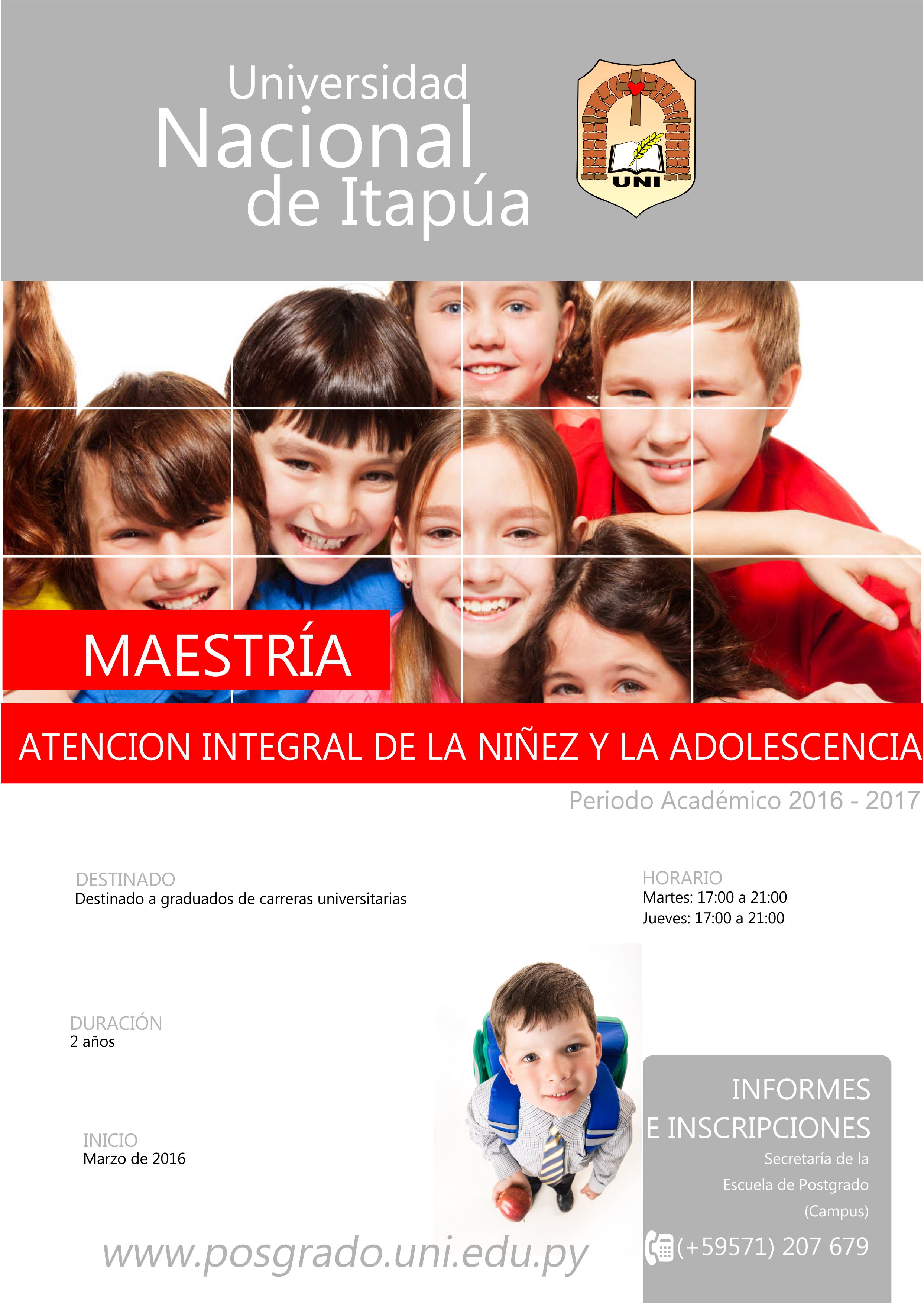 Se encuentran abiertas las inscripciones para el Programa de Postgrado “Maestría en Atención Integral de la Niñez y la Adolescencia” 2016-2017, en la Escuela de Postgrado de la Universidad Nacional de Itapúa – UNI, Bloque 7.