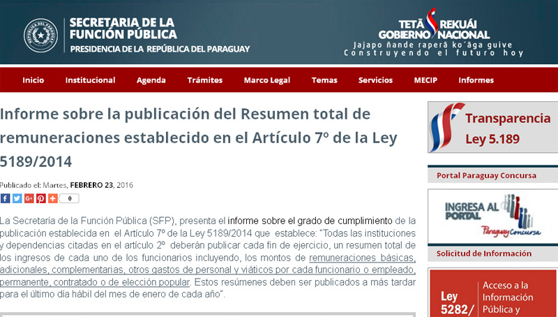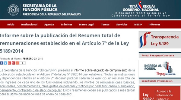 Hace instantes, la Secretaría de la Función Pública (SFP), ha publicado en su portal web el informe detallado sobre el grado de cumplimiento de publicaciones de documentos establecido en el Artículo 7º de la Ley 5189/2014, específicamente, el Resumen Anual de Asignaciones durante el Ejercicio 2015.