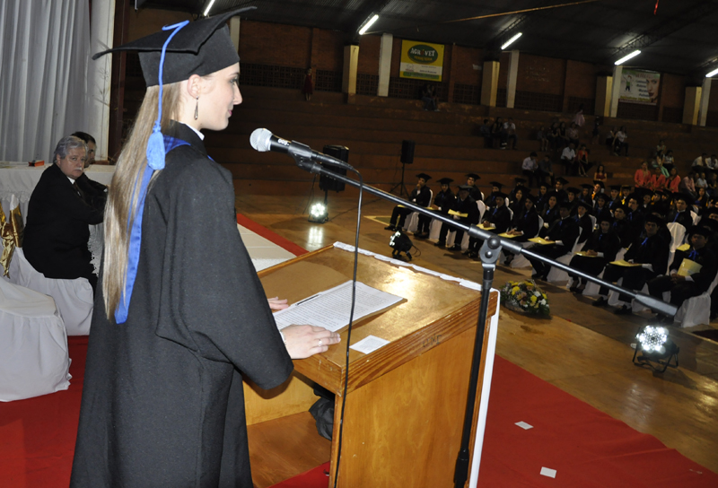 En otro momento manifestó “Cada uno de nosotros hemos dejado una marca propia, el sólo echo de habernos conocido y de convivir estos años más que como amigos como hermanos, entre las altas y bajar de todo el grupo, hemos hecho la diferencia, hemos llegado aquí y somos los mejores . Este es el un logro que cada uno ha soñado…un logro que hemos alcanzado con perseverancia, y gran esmero, horas de estudio y desvelo, renunciando a varias otras actividades, consagrados a recibir el ansiado título universitario. Llegamos aquí agradecidos y muy orgullosos. Hoy nos toca despedirnos de nuestras facultades, para comenzar una nueva historia…donde demostraremos que somos capaces y con el compromiso firme de transmitir nuestros conocimientos y los valores que hemos aprendido gracias a esta Universidad”.