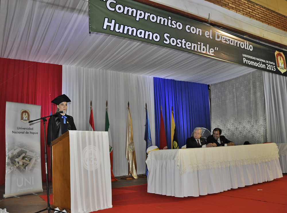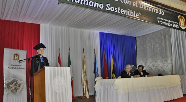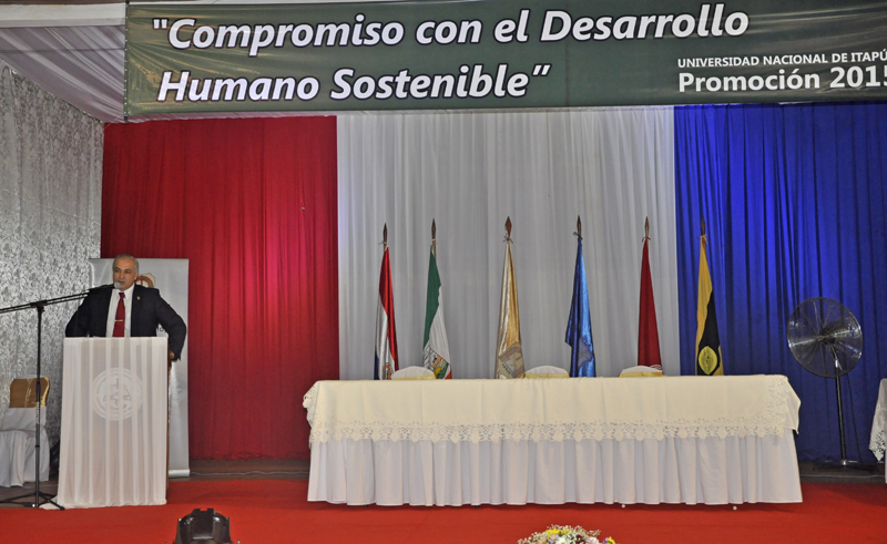 Mencionó luego que la Universidad Nacional de Itapúa en sus 19 años de vida institucional presencia coadyuva decididamente en el proceso de desarrollo socio-cultural, tecnológico y económico de la región y del país.. Indicó que queda claro que la educación es el factor preponderante en el desarrollo de las naciones y la UNI, lo ha interpretado así, estableciendose en puntos estratégicos del departamento –Encarnación, María Auxiliadora, Coronel Bogado, General Artigas, San Pedro del Paraná, Capitán Meza, Natalio y Mayor Otaño- para brindar oportunidades a los jóvenes de seguir sus estudios superiores en su propio hábitat, sin necesidad de emprender una azarosa migación a los principales centros educativos del país, mediante el estratégico liderazgo y visión solidaria del Sr. Rector Prof. Ing. Hildegardo González, secundado por un activo e incansable equipo de decanos y directivos superiores.