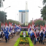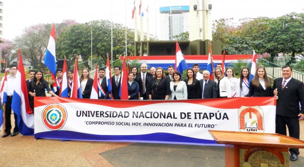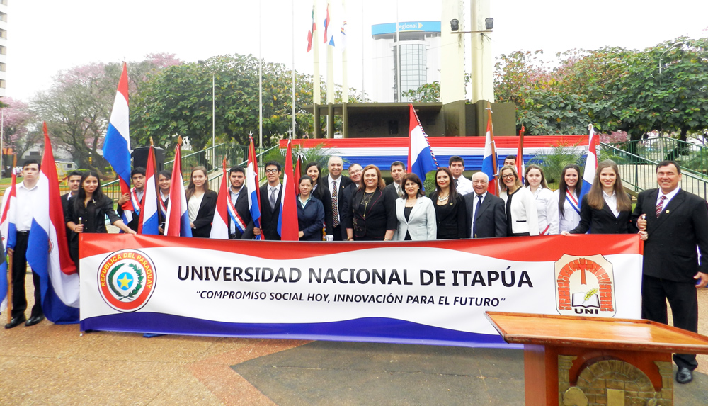 Directivos, decanos, docentes, estudiantes y administrativos de la Universidad Nacional de Itapúa (UNI) encabezado por la Vicerrectora Dra. Yilda Agüero de Talavera y el Presidente de la Comisión de conmemoración de los 400 años de Encarnación, Dr. René Arrúa Torreani, representaron a la Universidad en el acto protocolar en Conmemoración al Día de la Bandera Paraguaya que se llevó a cabo en la Plaza de Armas de la Ciudad de Encarnación, donde también estuvieron representantes de instituciones de los diversos estamentos de la sociedad encarnacena y regional, entre ellos estudiantes y directivos de colegios y universidades, autoridades locales encabezado por su intendente el Abg. Hugo Barreto, Concejales municipales y departamentales, representantes del Colegio Militar (COMISOE), Armada Nacional, delegación del Instituto de Altos Estudios Estratégicos (IAEES) del Ministerio de Defensa, quienes enaltecieron el símbolo patrio. En la apertura fue entonado el Himno Nacional con el acompañamiento de la banda municipal Santa Rosa.